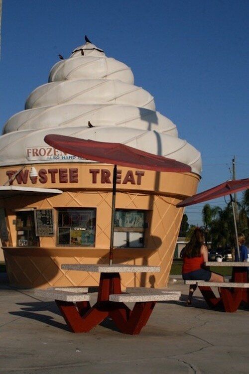 One local example is found in San Carlos: The Twistee Treat, designed to look like a giant ice cream cone, silently shouts just what can be found there.