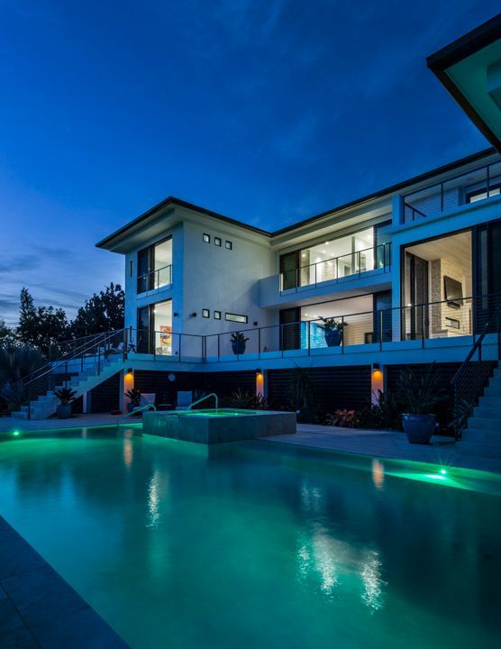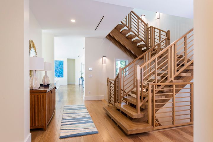 Oak flooring throughout and bleached oak on the ceilings, along with hints of blues keeps the home light and tropical. The stunning warm-wood floating staircase, complete with skylights and windows, floods the center of the home with natural light.