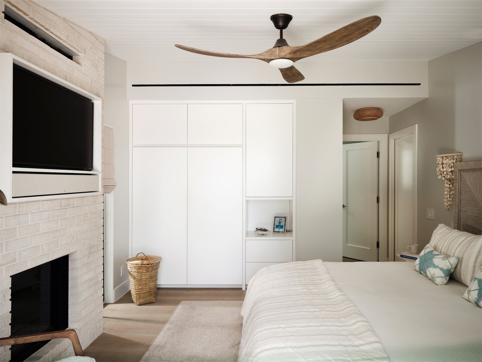 In the master bath, built-in cabinetry optimizes space while maintaining the cottage's small and cozy feel. A large window captures the surrounding landscape, providing a serene backdrop while ensuring privacy. Additionally, a custom-built brick fireplace enhances the ambiance of the master bedroom, adding to the cottage's cozy atmosphere.
