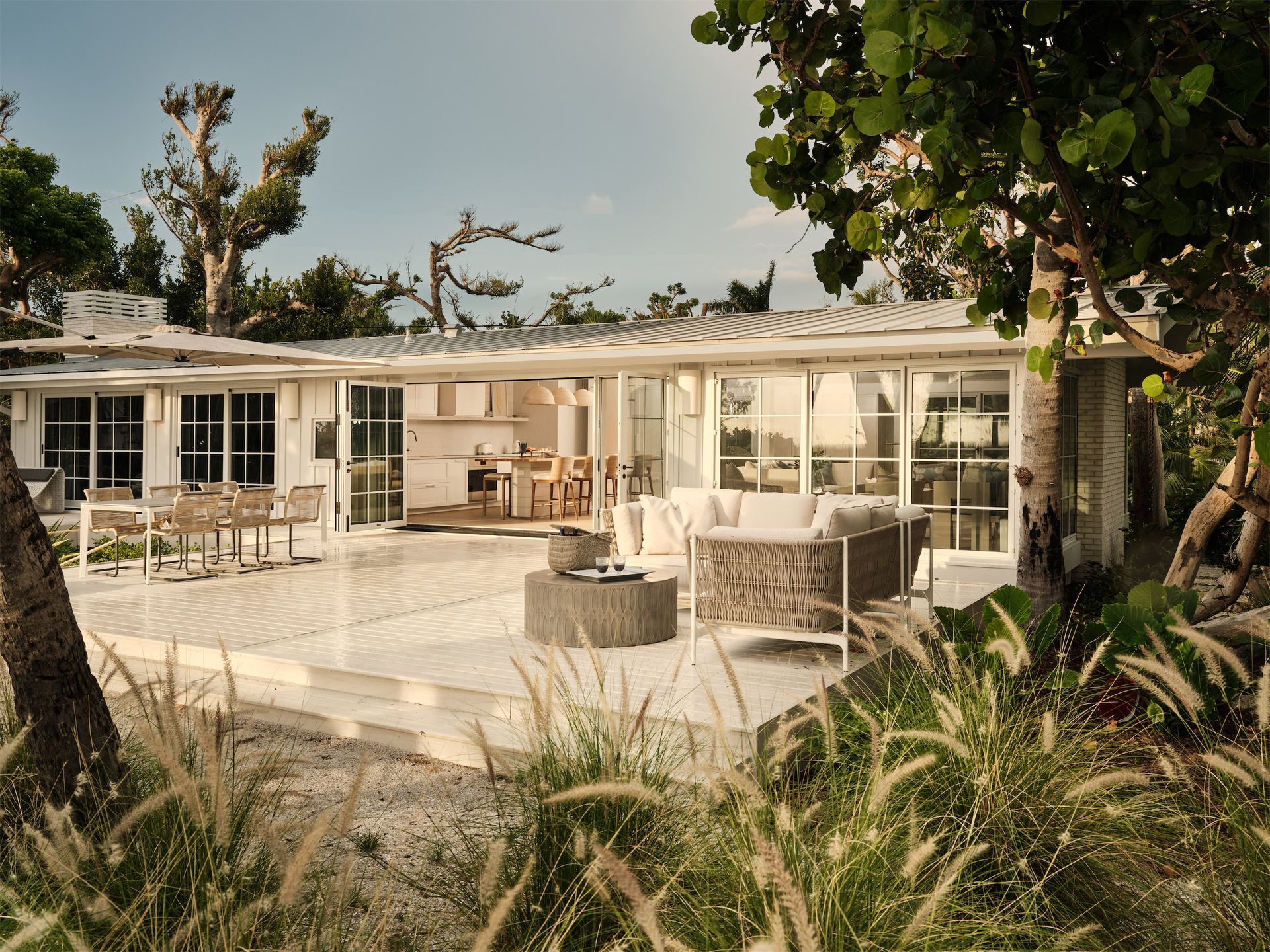 Architecture Joyce Owens undertook a transformative renovation, expanding and updating the original layout to create a rejuvenated space filled with natural light. The team reconfigured the layout, incorporating floor-to-ceiling windows and extending the living room into the existing lanai space to create a beachfront pavilion with stunning tropical views.