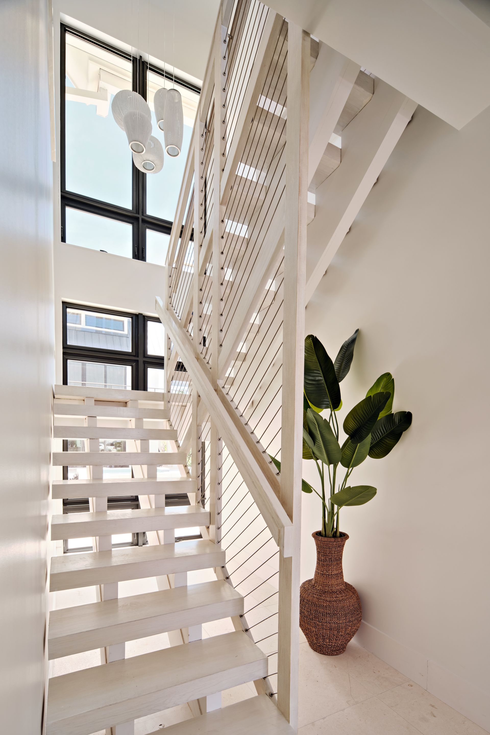A hallmark of the design is the custom floating staircase, which blurs the boundary between indoors and out. At its base, natural rocks continue from the outdoor landscape into the interior, creating a breathtaking connection to nature.