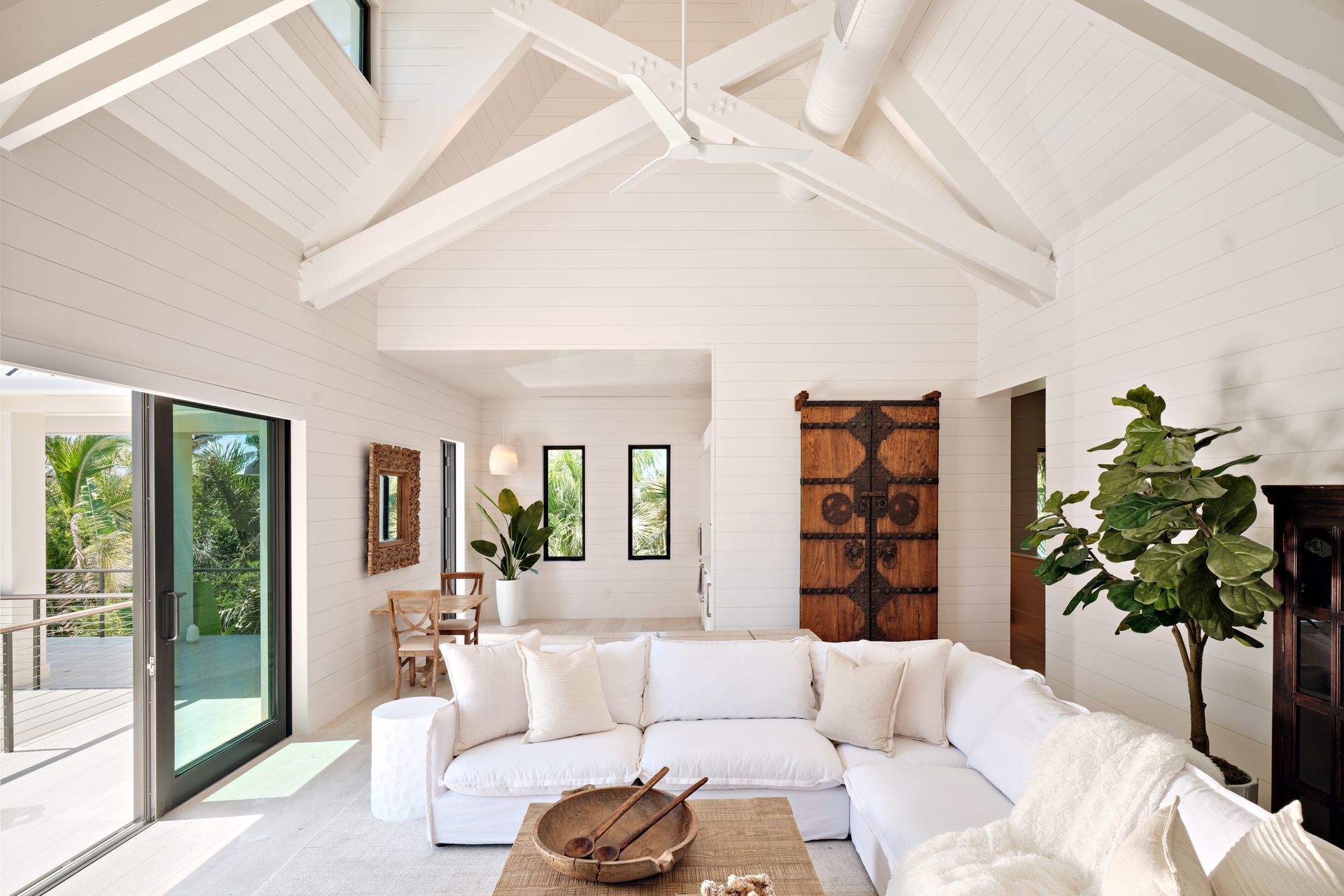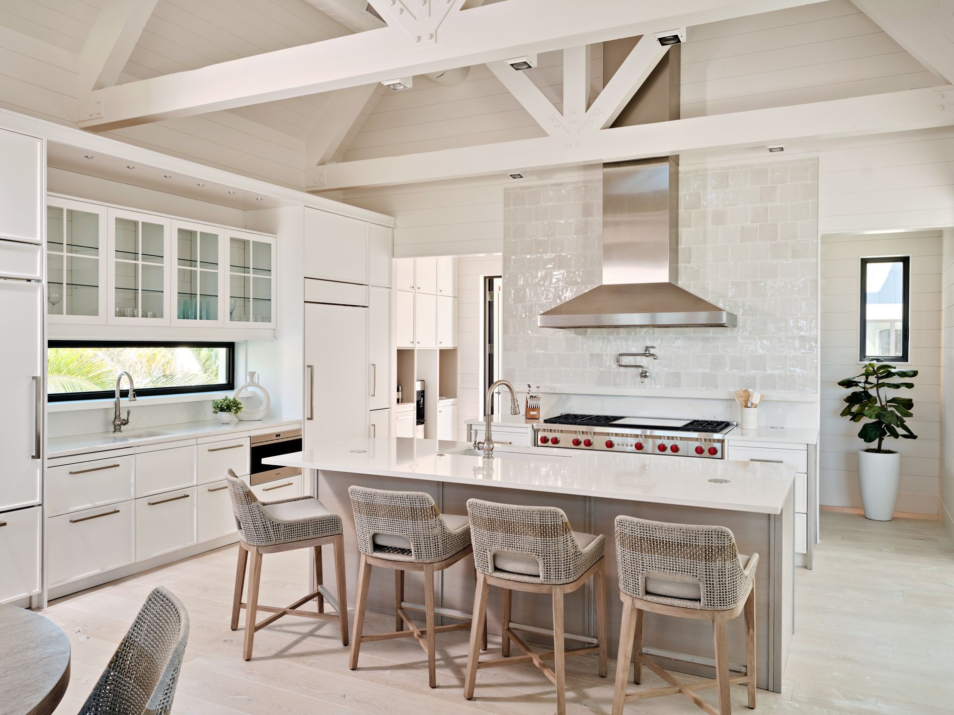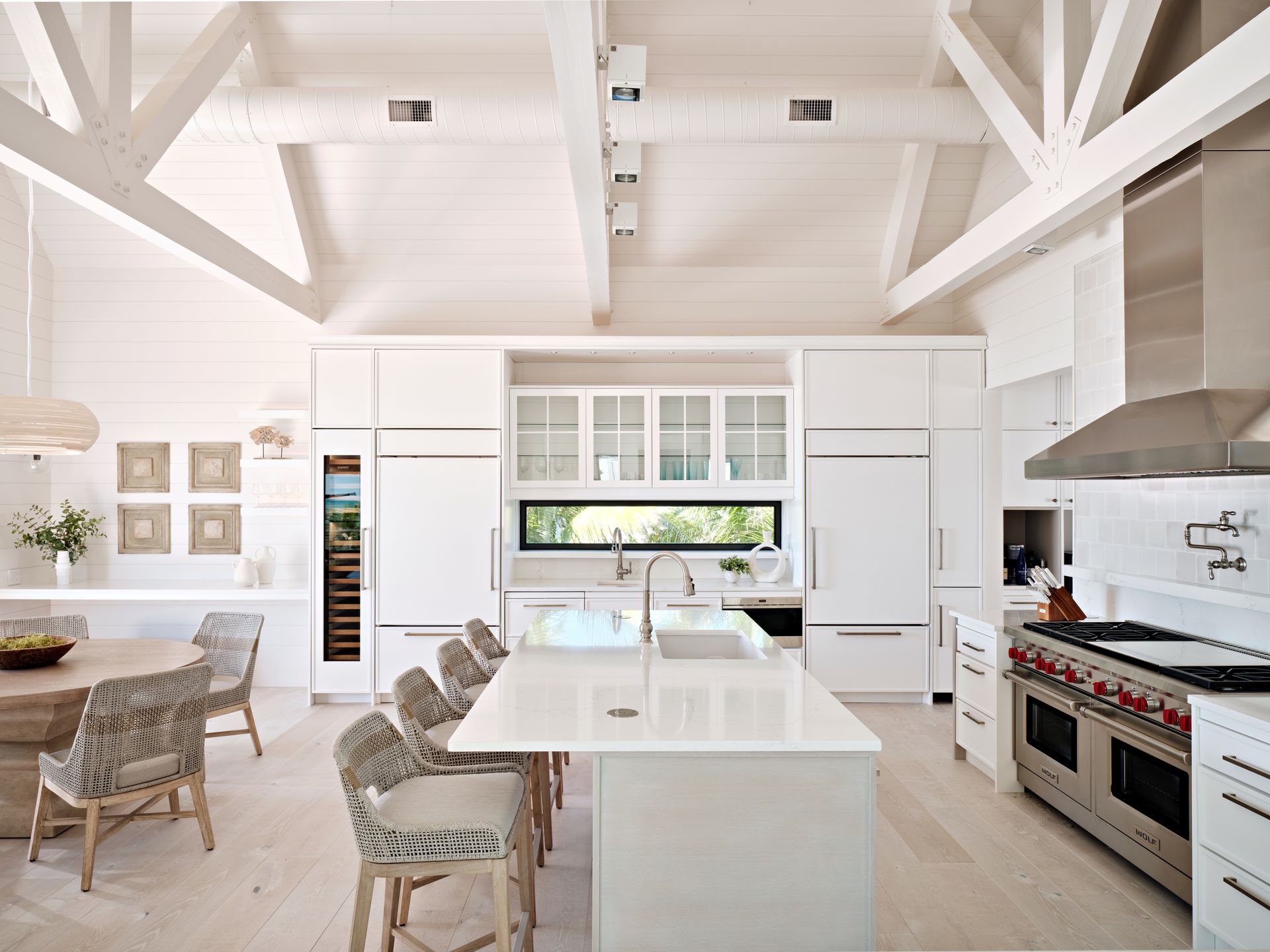 Inside, the home features three bedrooms, four and a half baths, dual offices, an art gallery, a media room, and a steam room, with seamless transitions into the outdoor living areas. Custom built-ins throughout the home, each designed by AJO, anchor the interiors with both function and artistry. In the media room, a wood-stained ceiling brings warmth and intimacy; in the kitchen, a textured ceiling covering adds subtle depth.