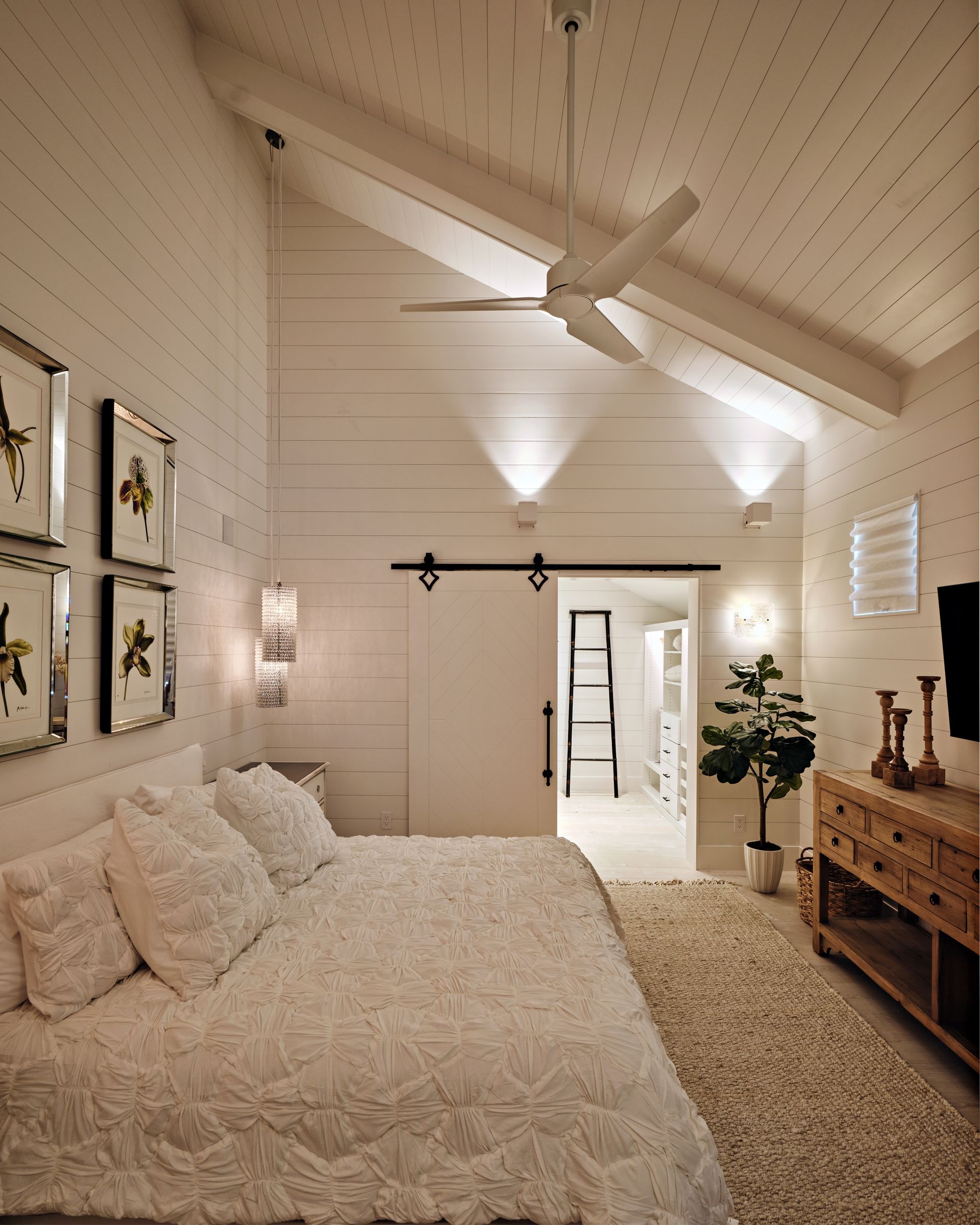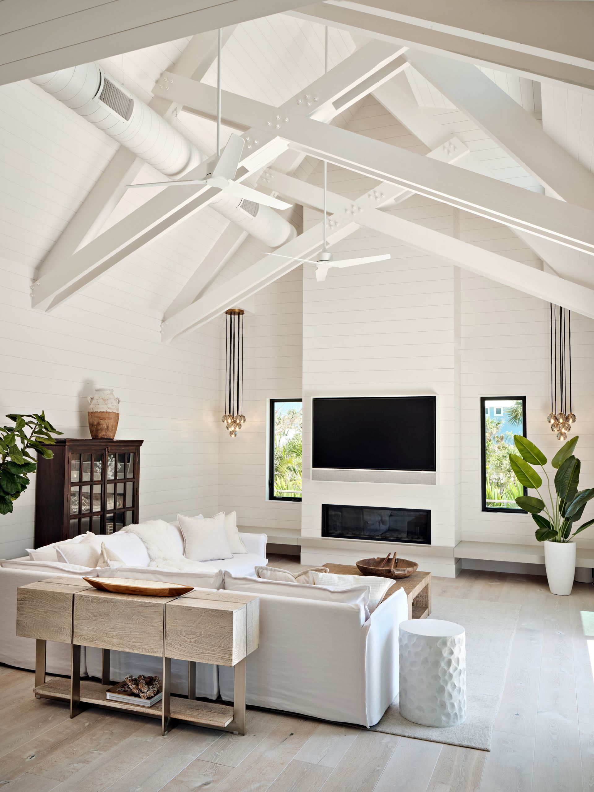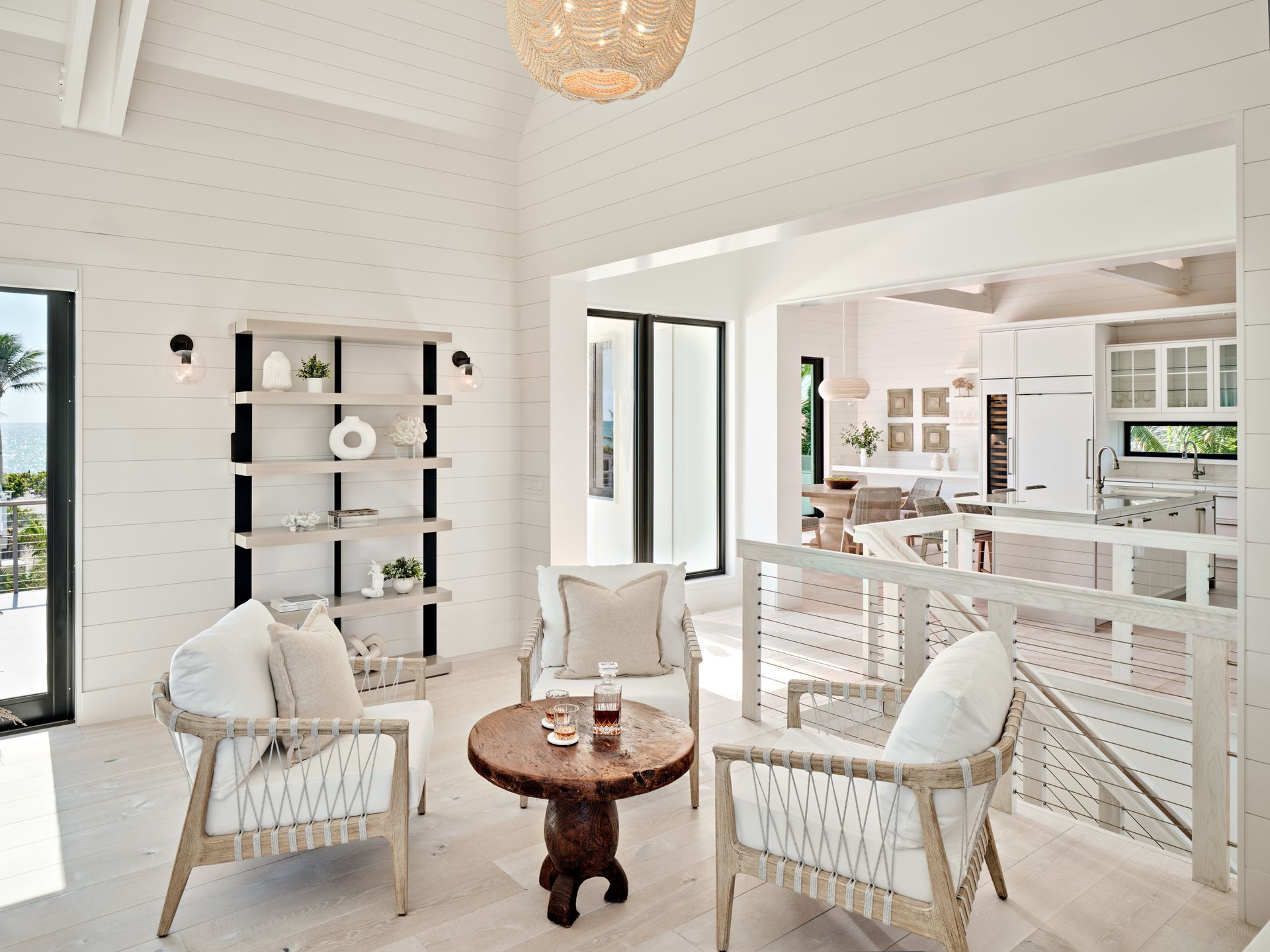 Inside, the home features three bedrooms, four and a half baths, dual offices, an art gallery, a media room, and a steam room, with seamless transitions into the outdoor living areas. Custom built-ins throughout the home, each designed by AJO, anchor the interiors with both function and artistry. In the media room, a wood-stained ceiling brings warmth and intimacy; in the kitchen, a textured ceiling covering adds subtle depth.