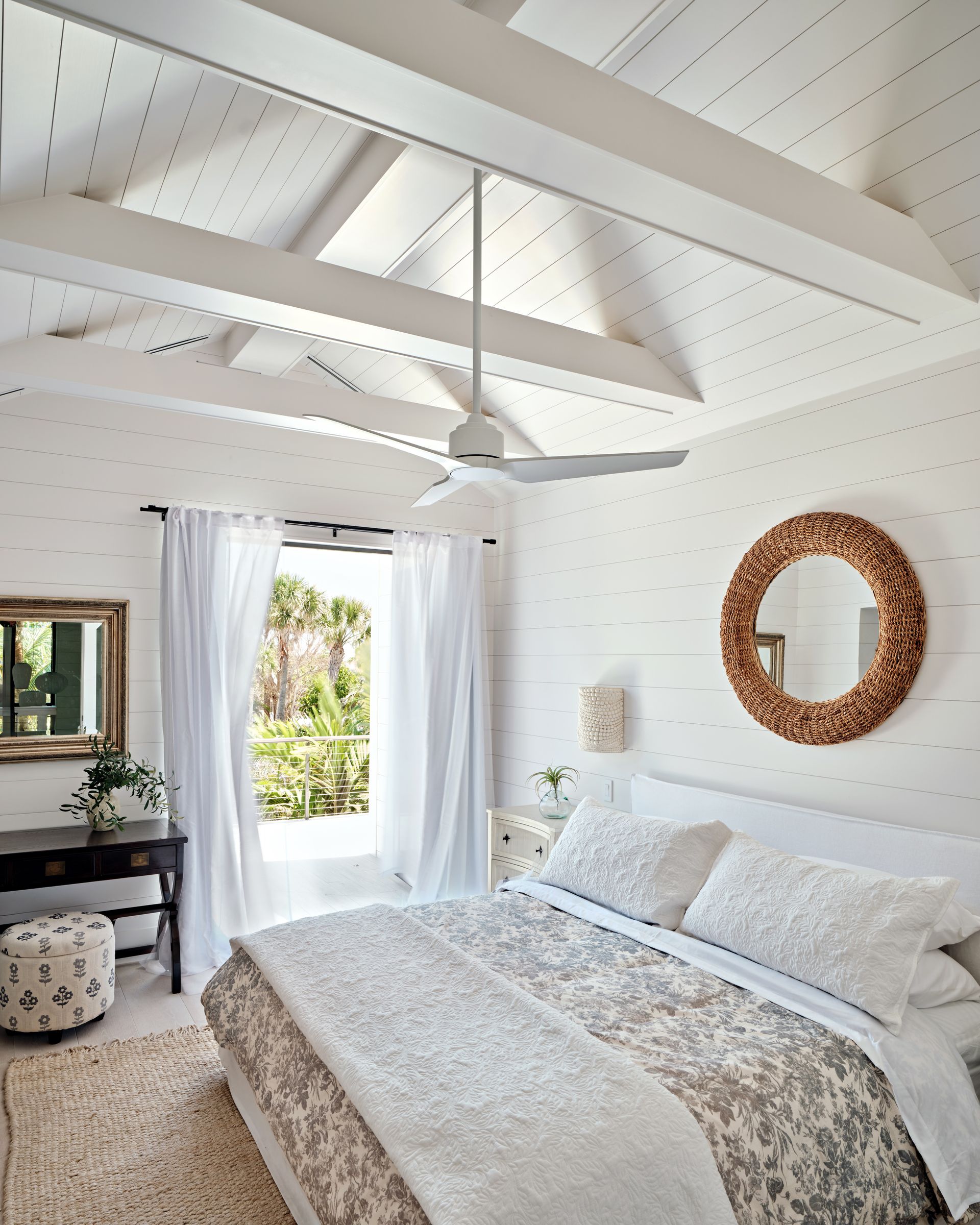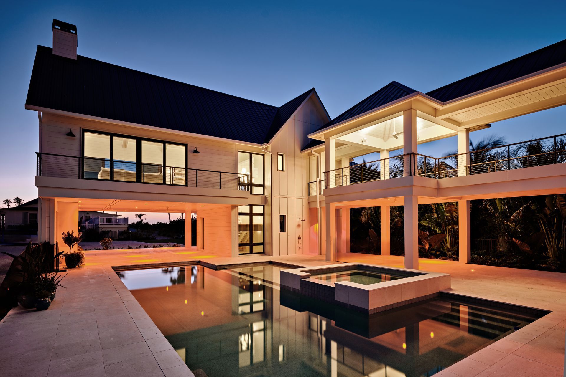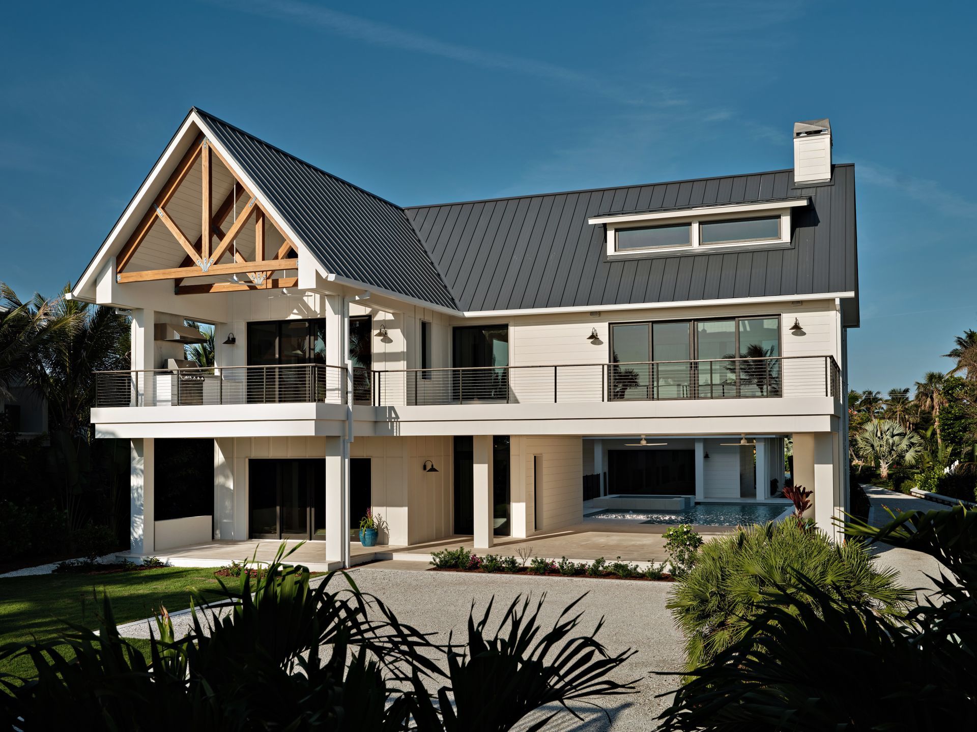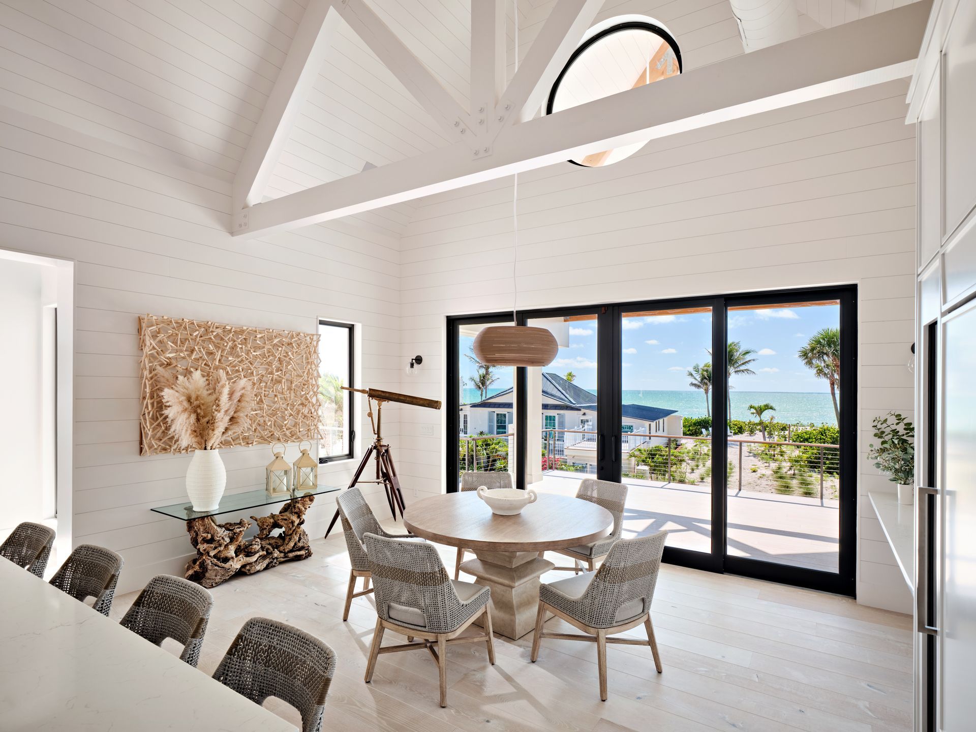 Outdoors, expansive balconies frame views of the Gulf of Mexico, while a pool, cabana with swings, outdoor kitchen and dining area, fireplace lounge, and a zen-inspired sculpture garden complete the resort-like experience.