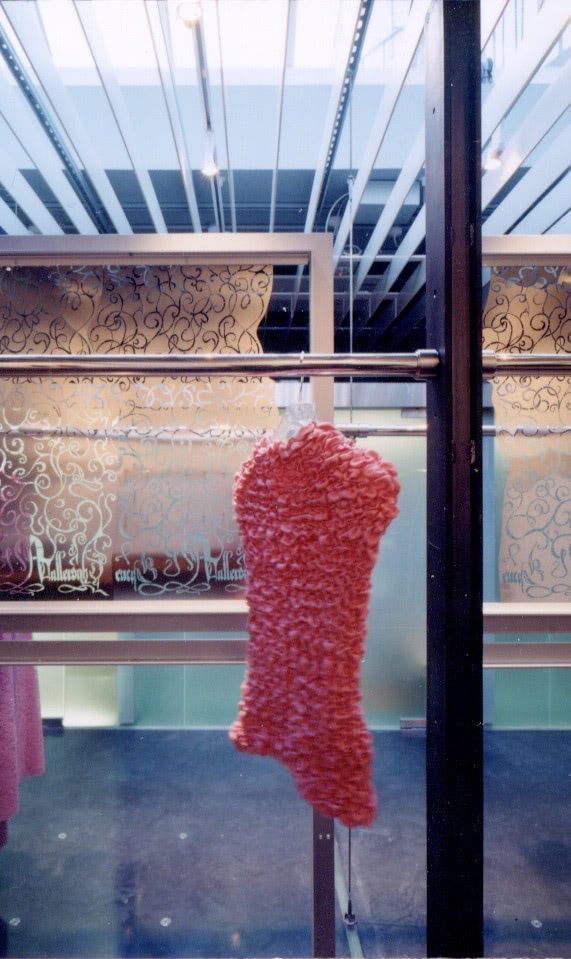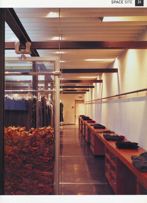Contrasting with the inviting composure of the frontage, the material finishes of the display space underline an intended informality and rigorous linear neutrality. There are polished concrete floors, timber cabinets, and aluminum fins over the ceiling to obscure the services and lighting above. “The steel beams alone cost a quarter of the entire budget…which was the intention… McQueen doesn’t like to see light fixtures at all.” Quotes Trocme, Suzanne. “metamorphic McQueen.” Interior Design, April 2000.