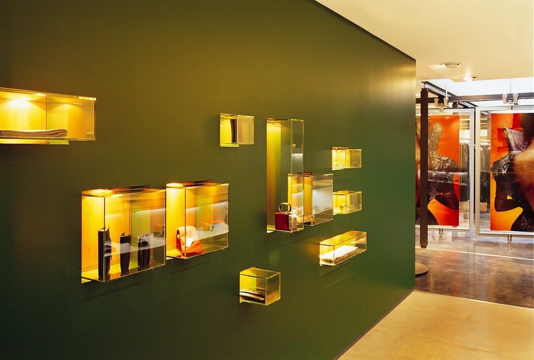 Azman Owens created a glazed frontage for the store, thus exposing the limits of the 32 metre-long space which is divided into two sections. At the front, an entrance area sets initial impressions and offers immediate views from the street. It is lavishly treated, with limestone tile floors and a display wall that is painted a new colour every season and supports an irregular array of small, jewel-like, glass box insertions for accessories displays. An eight metre-long, cantilevered display and sales counter traverses deep into the space and is clad in anodized aluminum.