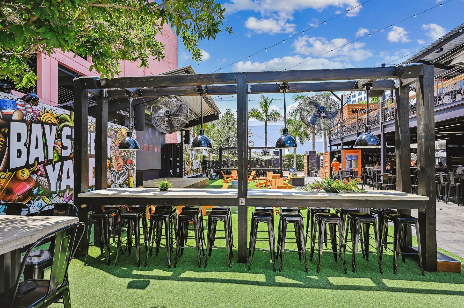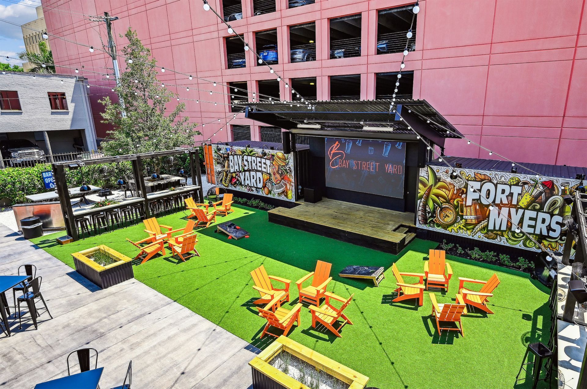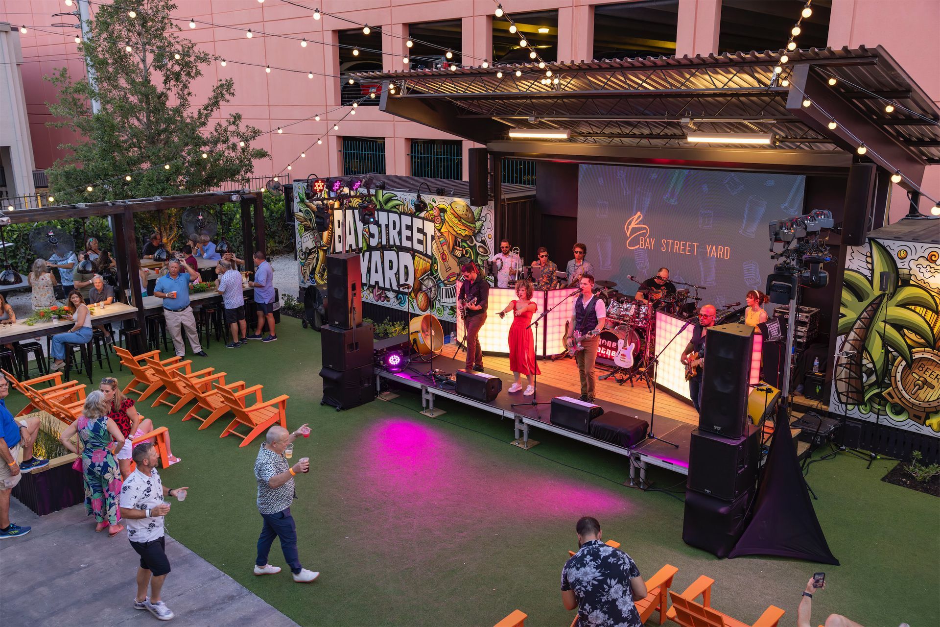 The layout of the yard has a diverse range of areas such as a food truck alley, stage and Jumbotron, two bars and a variety of seating areas, including the VIP upper deck, high-top drink rails, lounge chairs, and intermingled open spaces for dancing or playing games with lush greenery throughout.