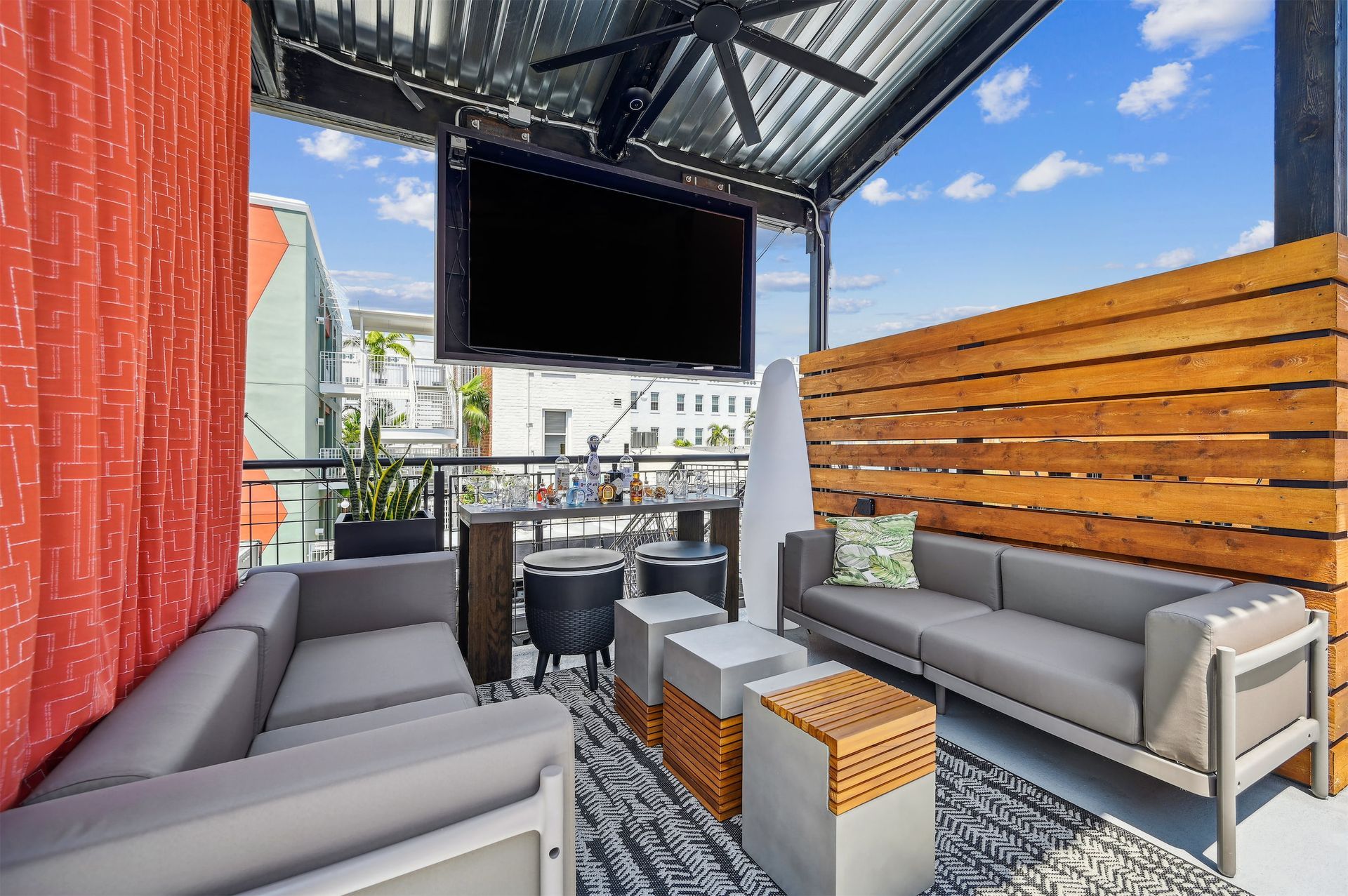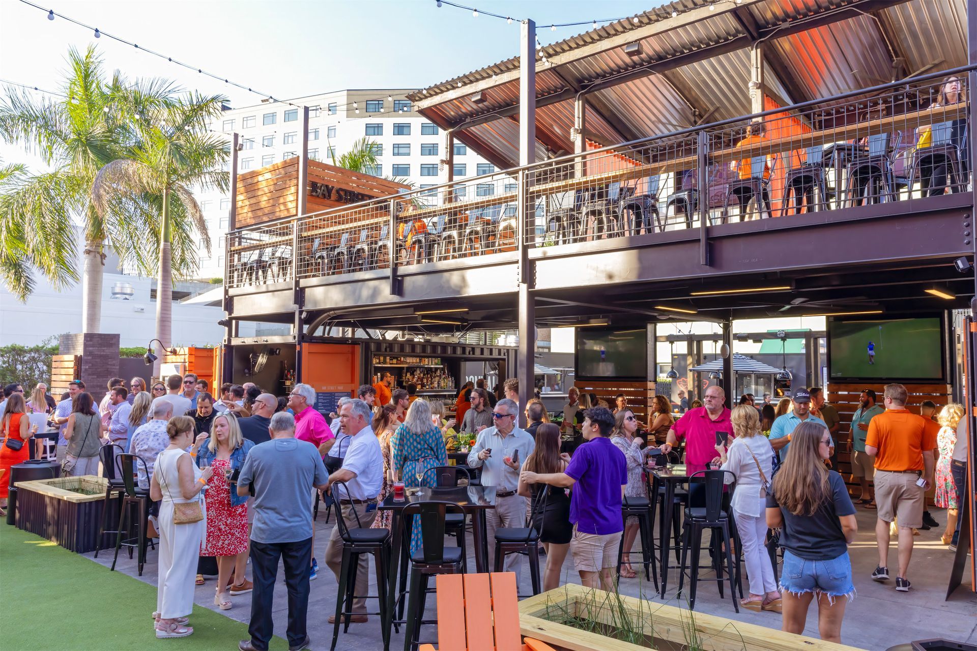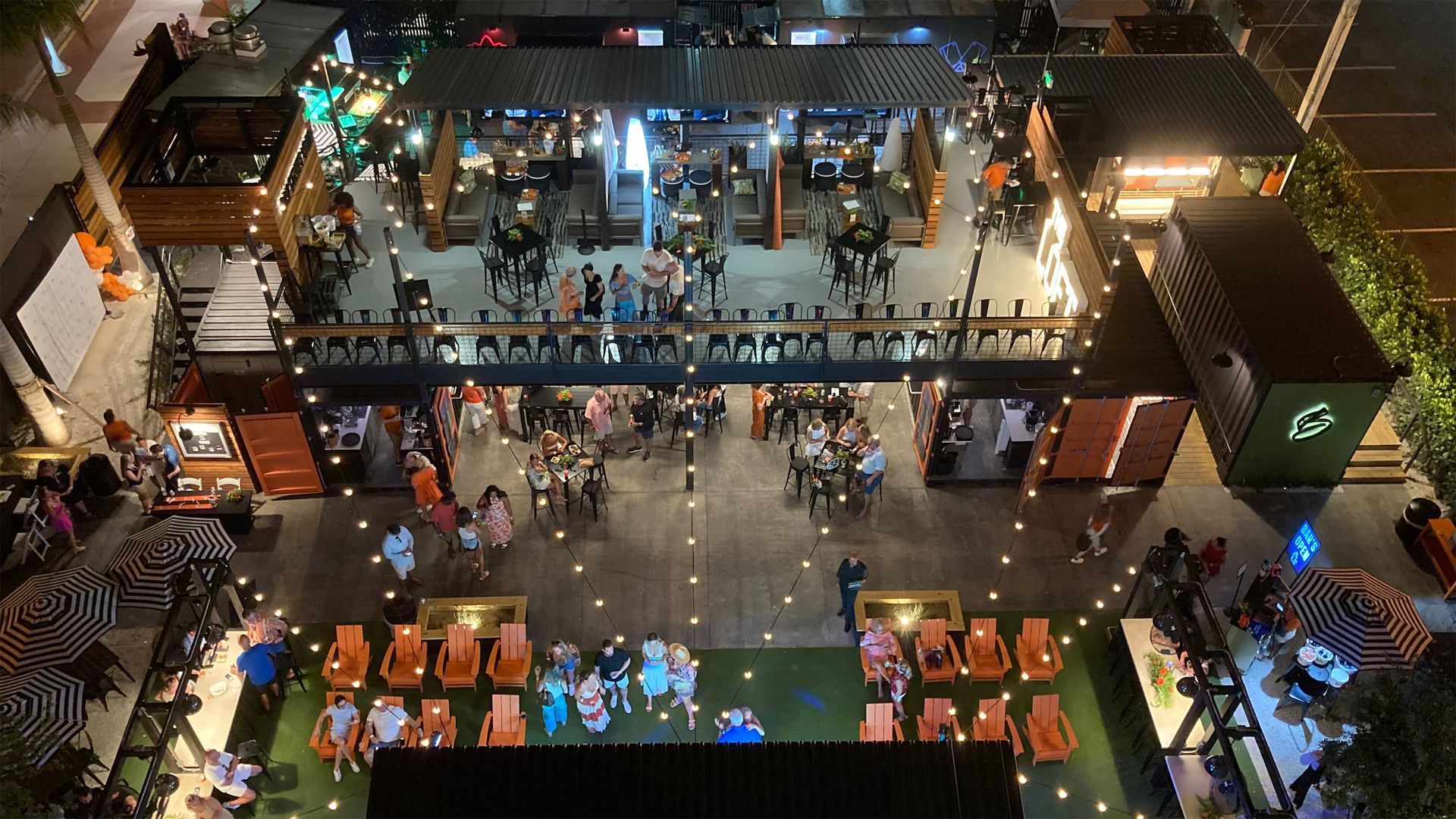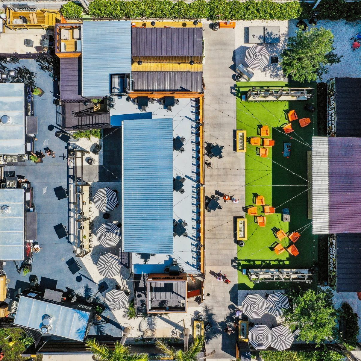 The layout of the yard has a diverse range of areas such as a food truck alley, stage and Jumbotron, two bars and a variety of seating areas, including the VIP upper deck, high-top drink rails, lounge chairs, and intermingled open spaces for dancing or playing games with lush greenery throughout.