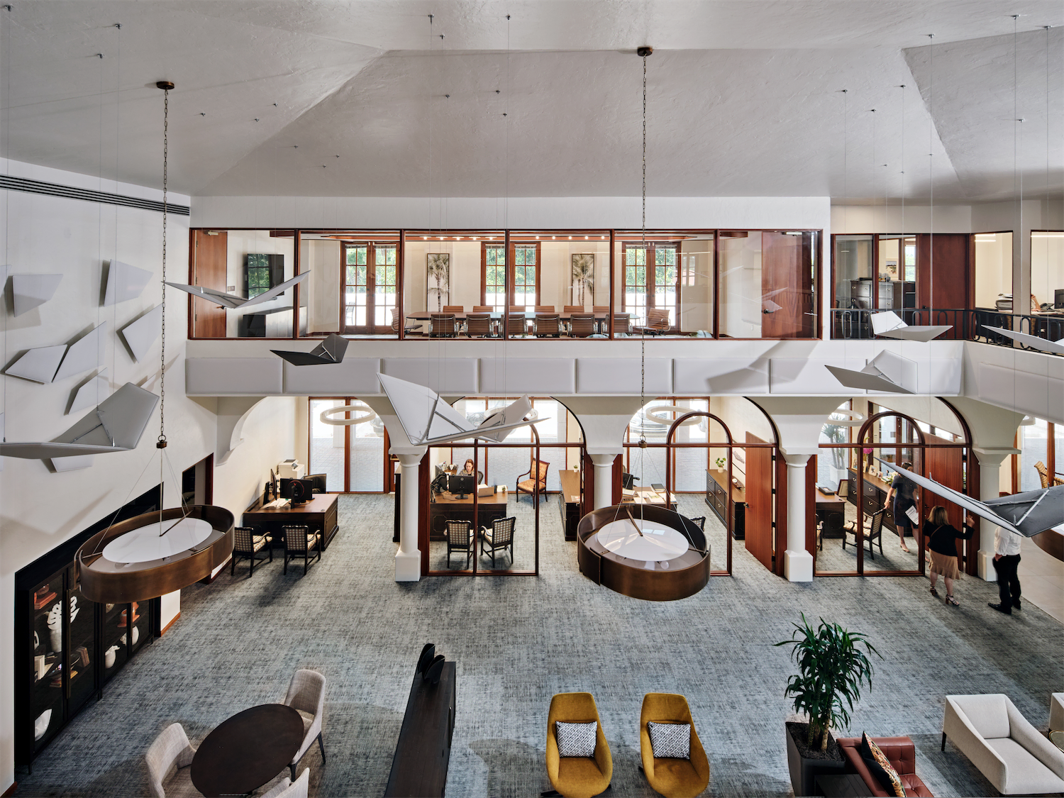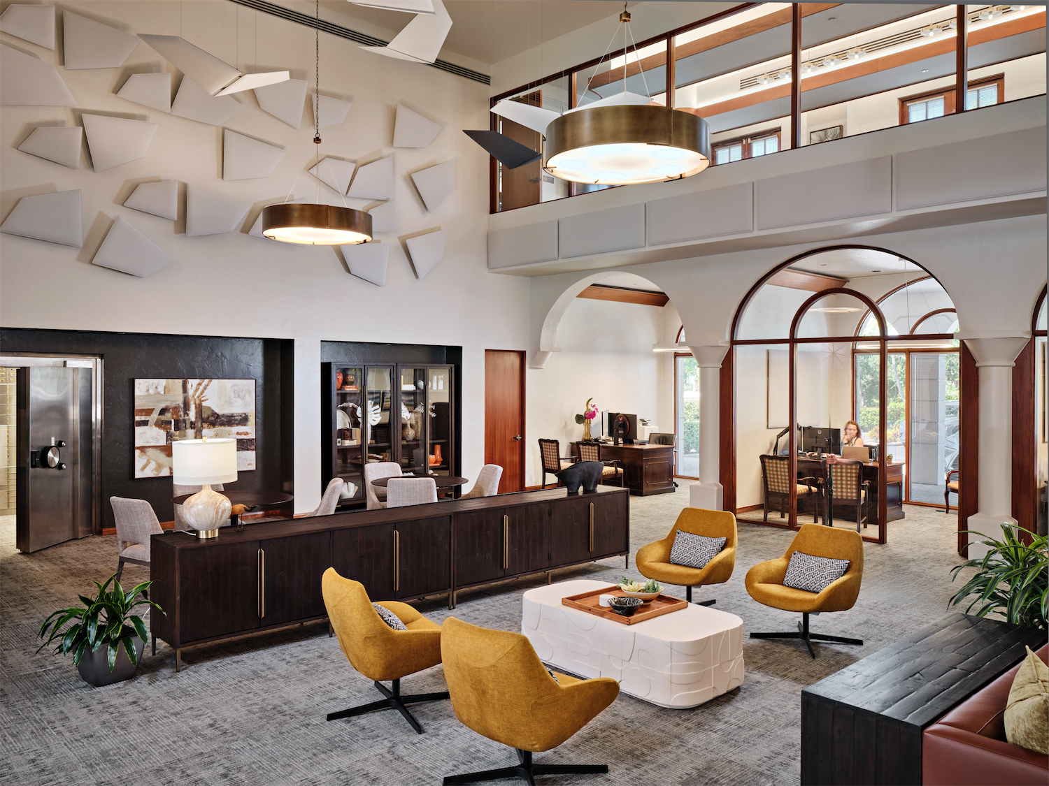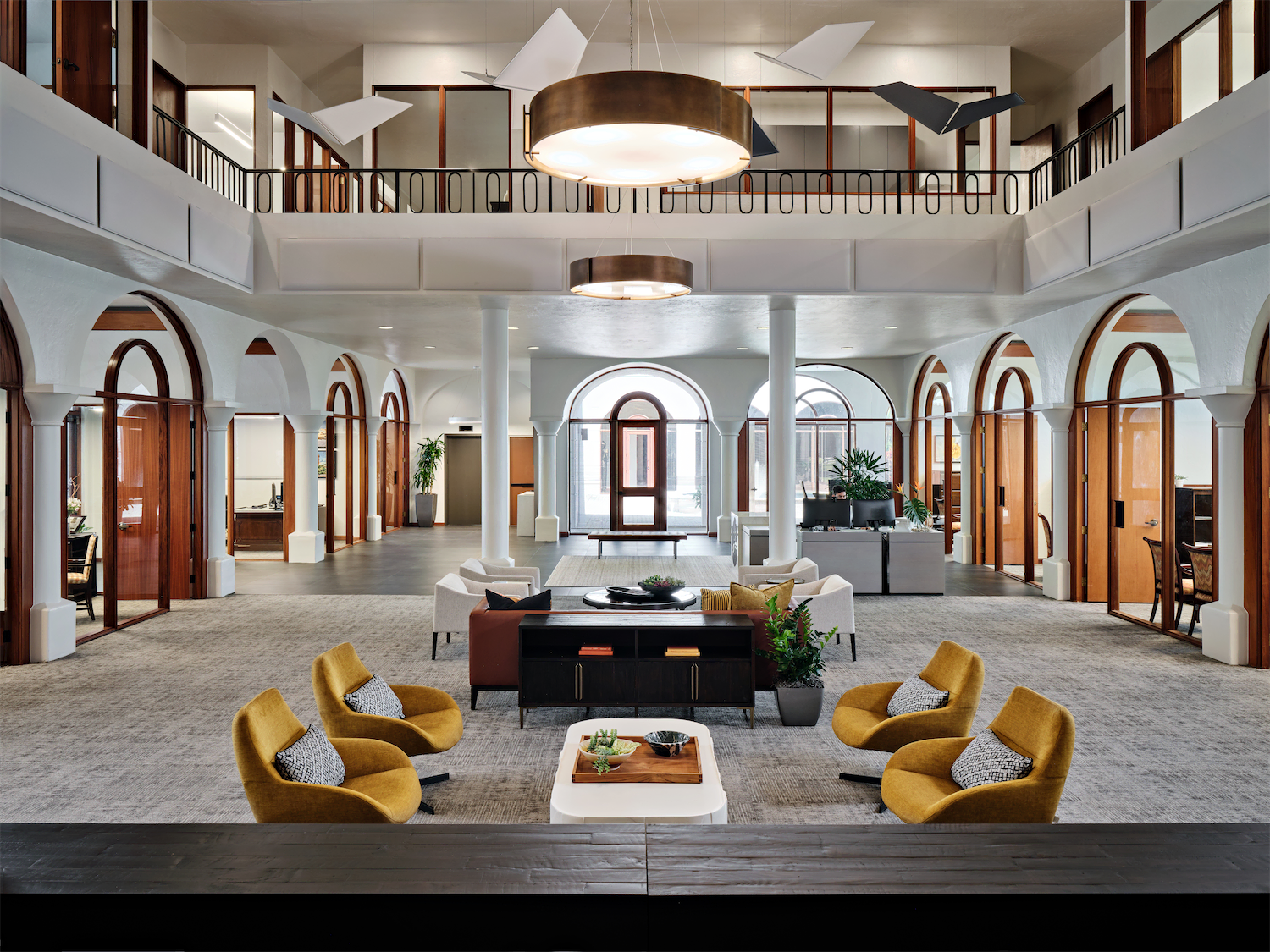 Originally constructed in the 1980s in an elegant Mediterranean classical style, the building featured grand arched windows that opened to both the outdoors and interior offices. While charming in its day, the space had become obsolete and required a
