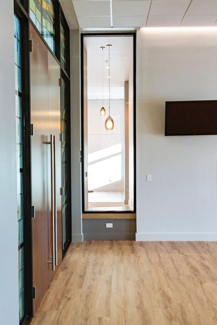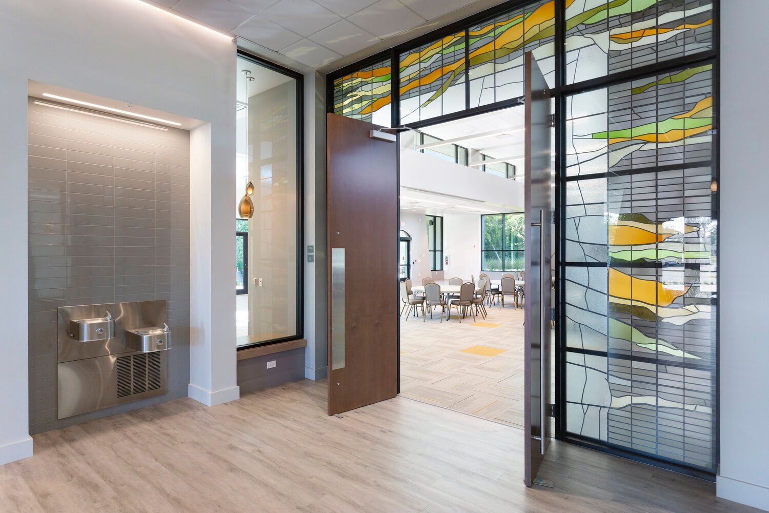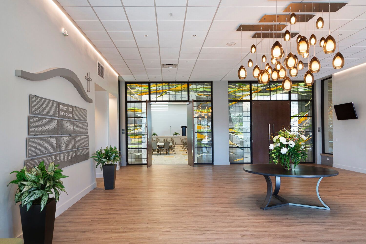 The large expanses of glass provide transparency and lightness that allow outside onlookers to observe the activity inside and intentionally welcomes the community inward. The porte-cochere and tall wooden entry doors open upon a generous vestibule where parishioners and guests are greeted with high ceilings, a wall of stained glass tailored specifical to the space, a hand-blown glass chandelier, and an artist-designed donor appreciation sculpture installation.