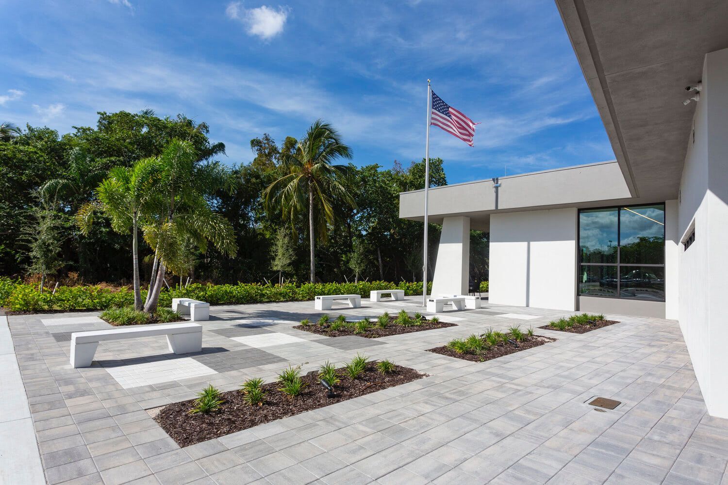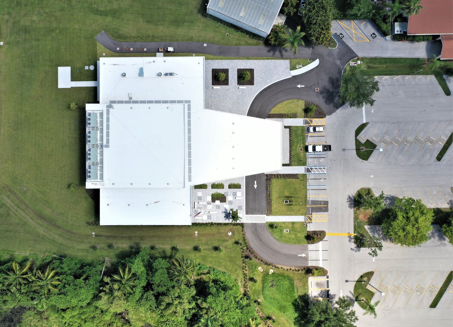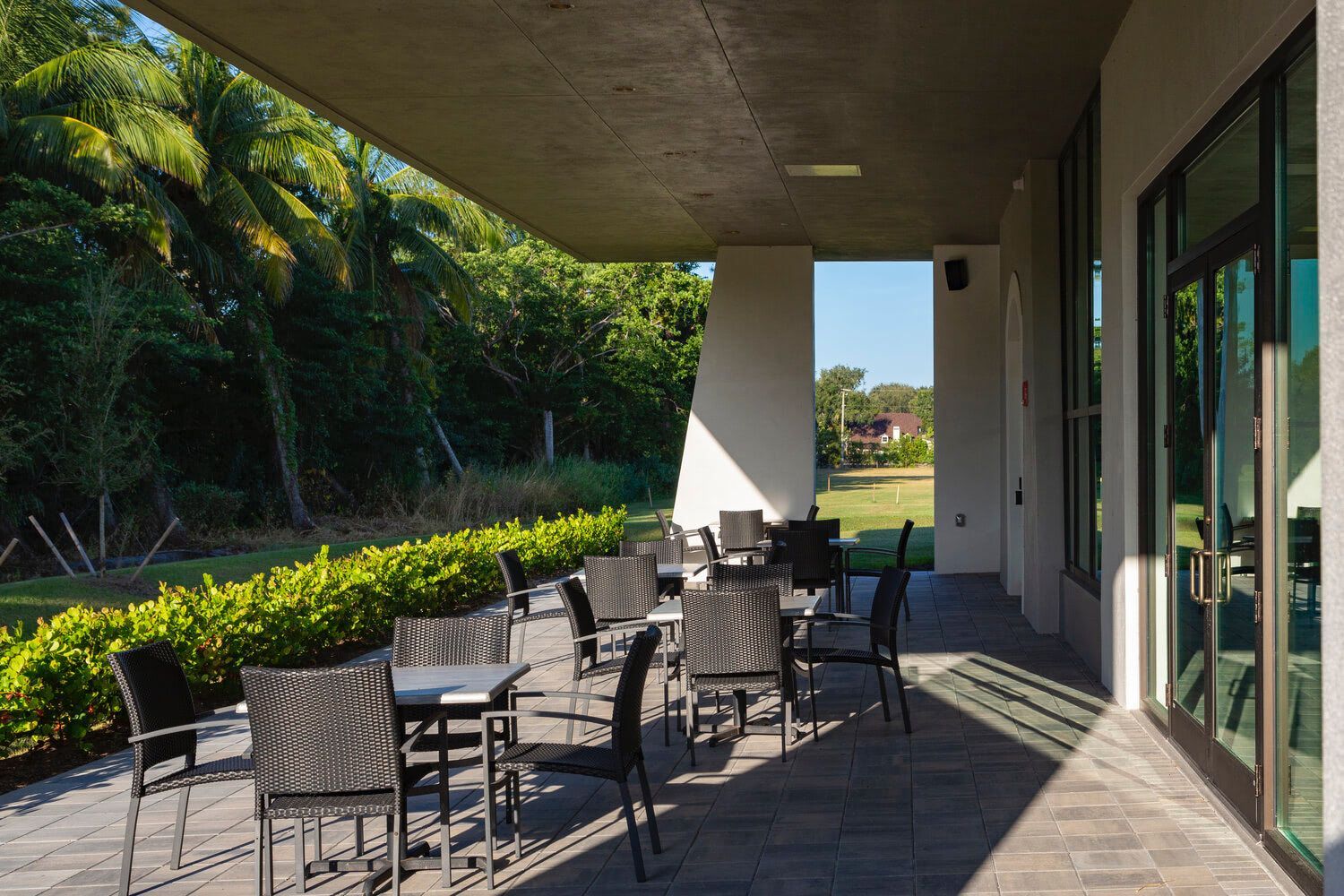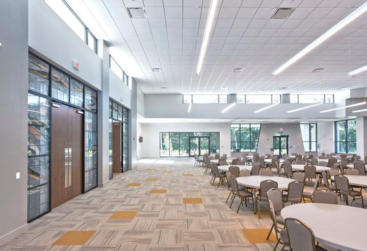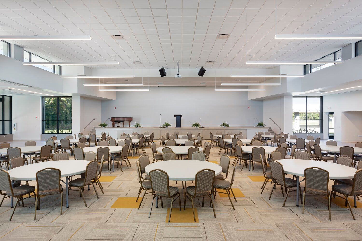 The main event hall captures the openness of an outdoor pavilion. The large windows all-around and clerestory windows above keep the space filled with daylight while articulating the important connection to the sky, lush green landscaping and the outdoor amenities. Side doors open onto a large covered outdoor area and Celebration Courtyard, complete with personalized pavers and specially designed benches that provide attendants with outdoor gathering opportunities. The hall was designed to accommodate 350 people.