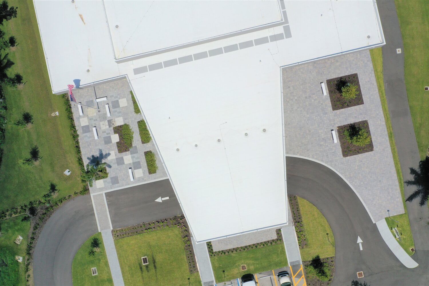 The hall incorporates a new, modern style with complimentary large roofs, a distinct entry, and outdoor gathering areas.