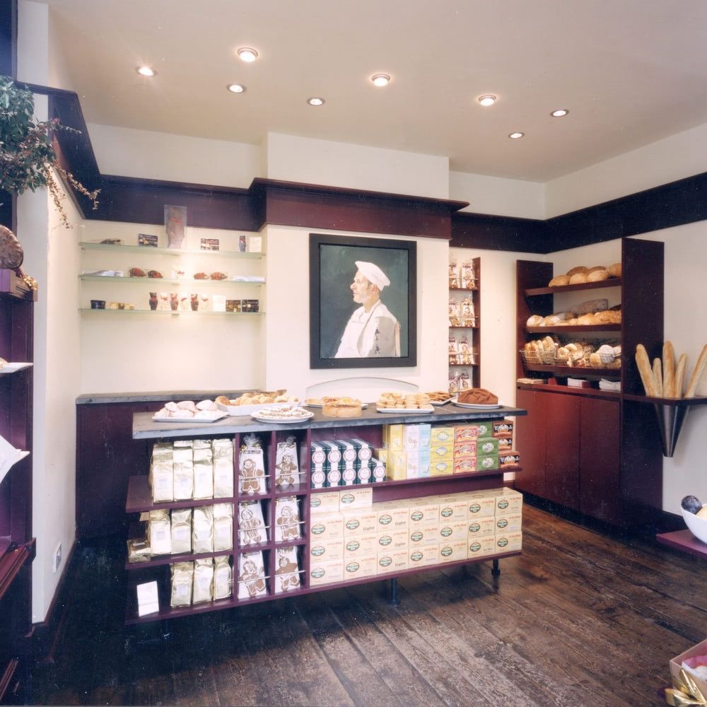 Inside the shop the original timber floor has been restored and the brick walls left with their richly patinated marks of age. Against this backdrop the architects have inserted a number of contrasting new elements. These include the maple-topped shelf for bread, the in-situ cast-concrete cash desk and the long stone-topped serving counter.